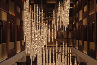 ,由著名纽约设计公司AvroKO设计。其设计如同一幅阳光穿越林间洒落的画卷,通过材质与空间节奏的驾驭,化解了大尺度的冷感。