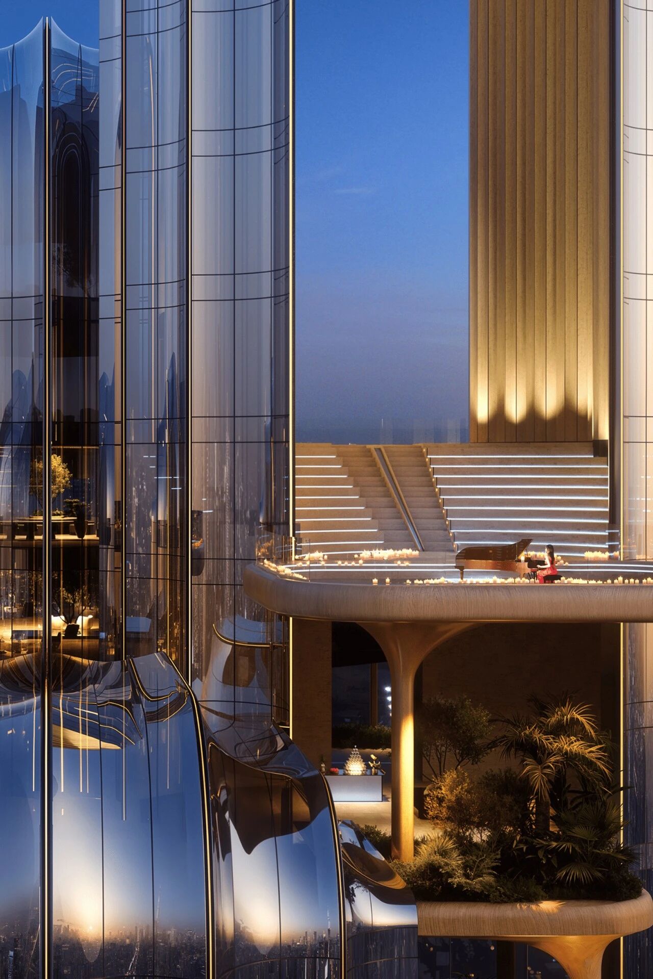 针对景观资源最佳、空间体验最独特的塔冠,设计布局超尺度 “云端剧场”。恢弘的尺度弱化了空间边界感,取而代之的是远眺海湾与诸多城市地标的无界感。这里,将吸引高端企业发布会、云端社交聚会、空中音乐会等城市事件发生,成为项目甚至城市的活力引擎。