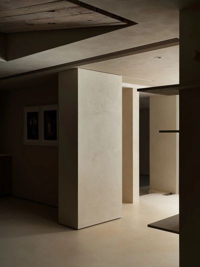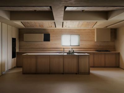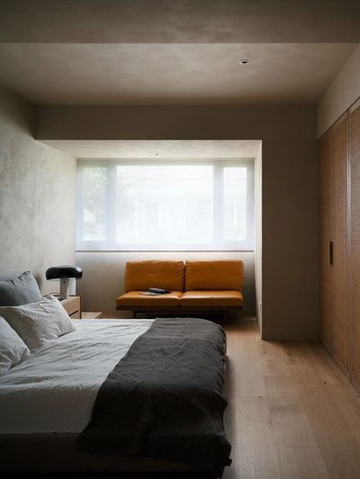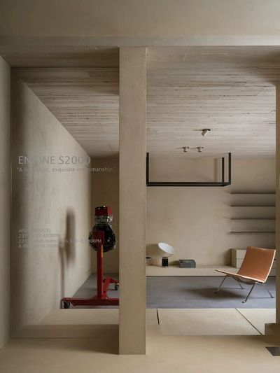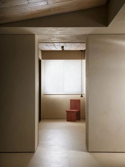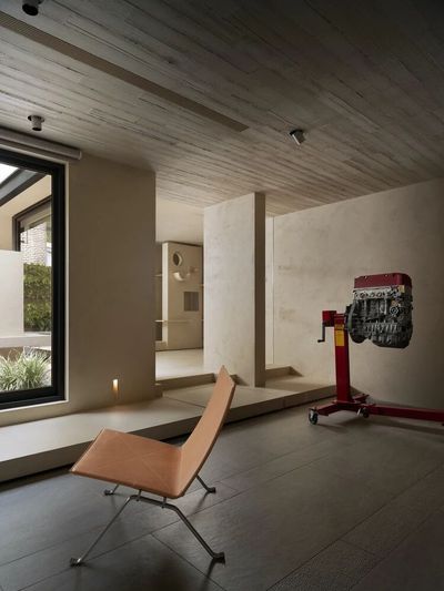 在主室内,一根无法拆除的 T 形梁曾造成压迫感。设计团队以此为契机,引入额外的梁,构成类似“田”字的格局,并在其间加入一片倾斜的天花板,呼应传统坡屋顶的形态。