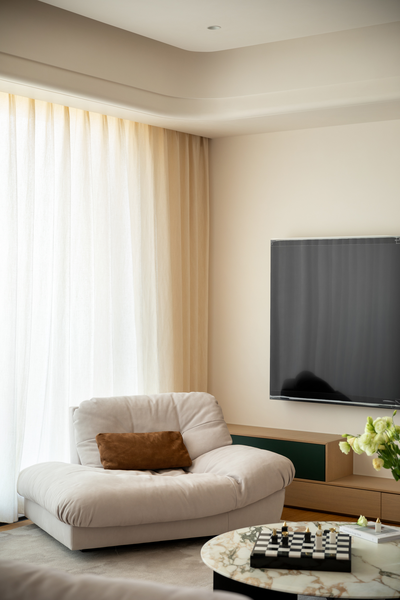 的天然优势。设计师以几乎占据整墙的超大玻璃窗,极大消弭了室内外的视觉界限,将城市天际线温柔纳入日常。居住者安坐客厅,亦可一览无余,感受天空、建筑与光影的无界对话。