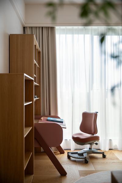 构建书柜与书桌,灵活可调的层板设计不仅适配不同阶段的收纳与学习需求,其鲜明的色彩和精致金属质感,也成为空间中一抹轻盈而充满活力的点缀。