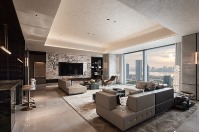 窗前软榻与小圆几相对,白日临景阅读,夜里小酌沉思。通顶玻璃柜与开放架围合衣帽间,灯带隐入背板,踢脚回光映托陈列。石材通铺的浴室尽头,独立浴缸正对景窗,功能隐入背景,留下整洁与缓和。