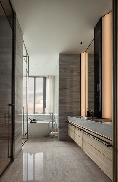 浴室的灰白纹理石材如水洗墨迹,含蓄而有表情,悬挑柜体让视觉厚度更显轻盈。通透玻璃分隔功能区,细致而有层次。窗边独立浴缸安放一隅,侧门隐秘,为生活保留余地。