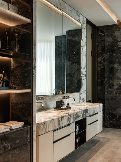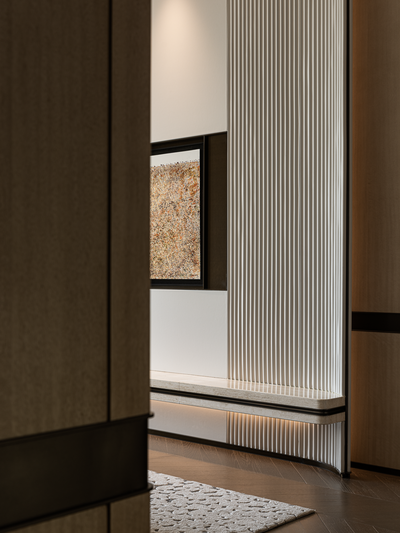 从过道走入私域,木饰面与暖灰石材交替铺展,灯壁与艺术作品点缀其上,像一段被压低声调的序曲,在主卧内,铺垫出细密的节奏。