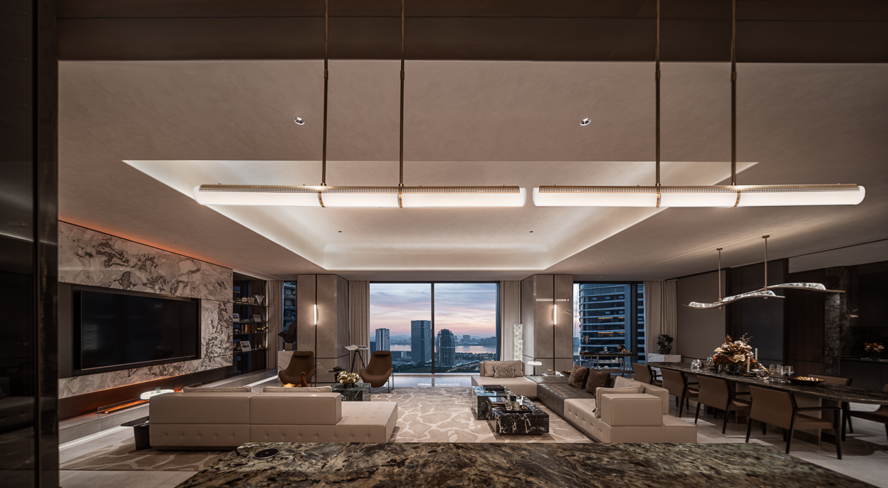 长桌石材深沉的纹理,在餐厅内映衬着波浪形吊灯,光影在金属与石面间流转。暮色下,餐椅围合出附有礼序的交流场域,光线沿着窗边柜体,映照出餐叙时刻的暖意。