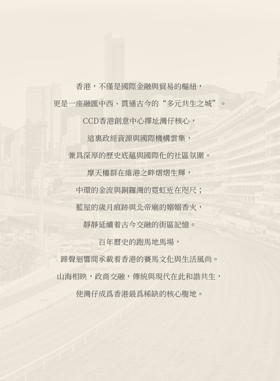 CCD香港創意中心位於灣仔道 228號,地處灣仔區的核心地帶。毗鄰跑馬地馬場與維多利亞港,與半山頂級豪宅相互對望,既可享受綠意開闊的視野,也能遠眺世界級海景。