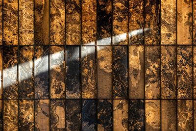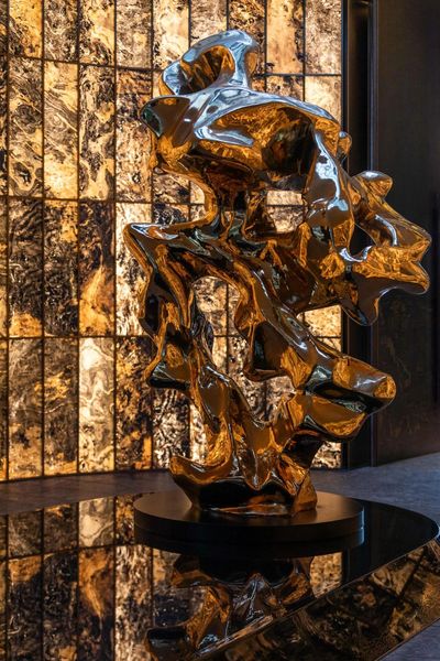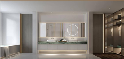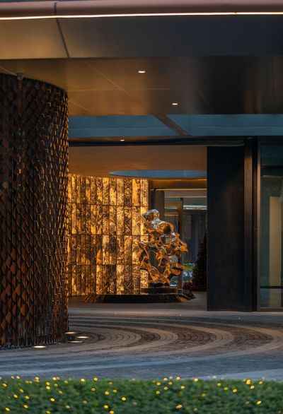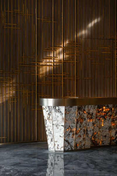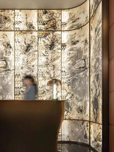 入口两边墙体采用 300 片透光进口石英云母超薄天然石材设计,每片纹理皆不相同,施工时设计师与施工师傅精心挑选、切割、排版后上墙,最终呈现出满屏天然奢石却又疏密得当的立体景墙,极大地提升了业主归家之路的尊贵感 ,完美诠释了 “大面积,多场景,可定制” 的奢石应用理念。