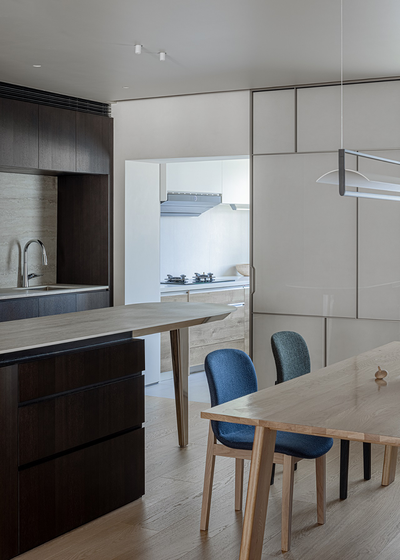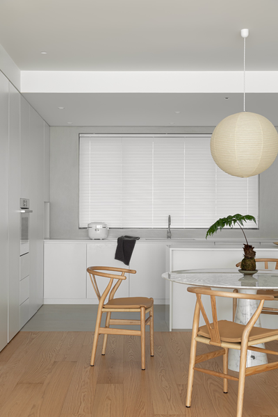 家庭餐厅里,雪花白石材的餐桌与纸质吊灯相映成趣。吧台台面与厨房台面连在一起,采用同样的石英石材质,让空间更统一。