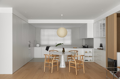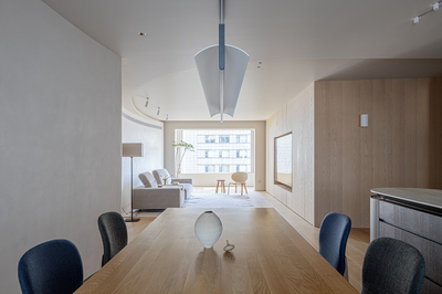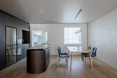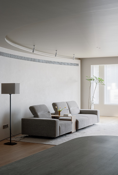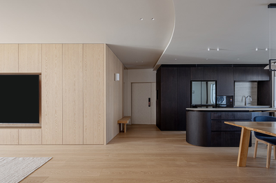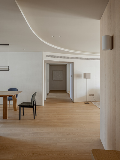 两道简洁的弧墙,将客、餐、厨、阳台连缀为一体。纯粹的形式为空间注入柔和的秩序感,用空间本体取代刻意装饰,让生活本身成为空间的焦点。