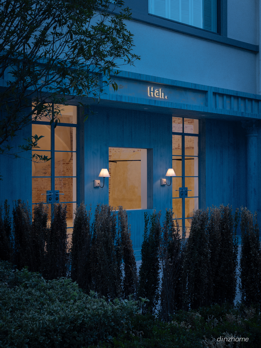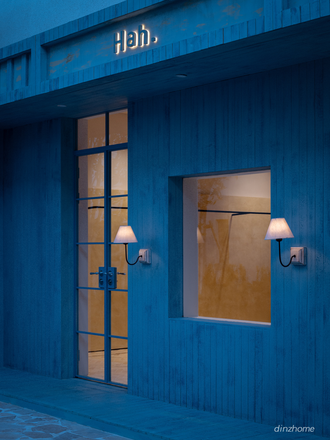 正午蓝天的明艳,也不同于深夜的深邃,而是带着傍晚特有的温润与静谧,让顾客刚步入店门,便能瞬间脱离外界的喧嚣,沉浸到主题氛围中。蓝色木板墙面采用纵向拼接方式,搭配同色系门框。