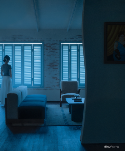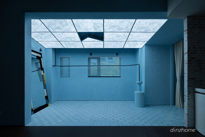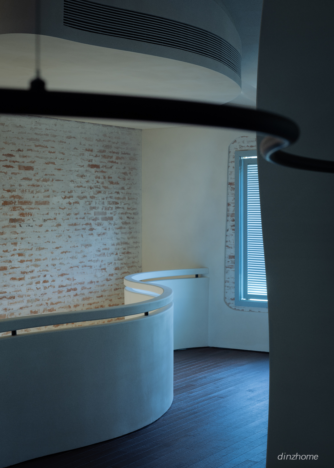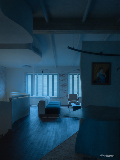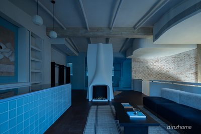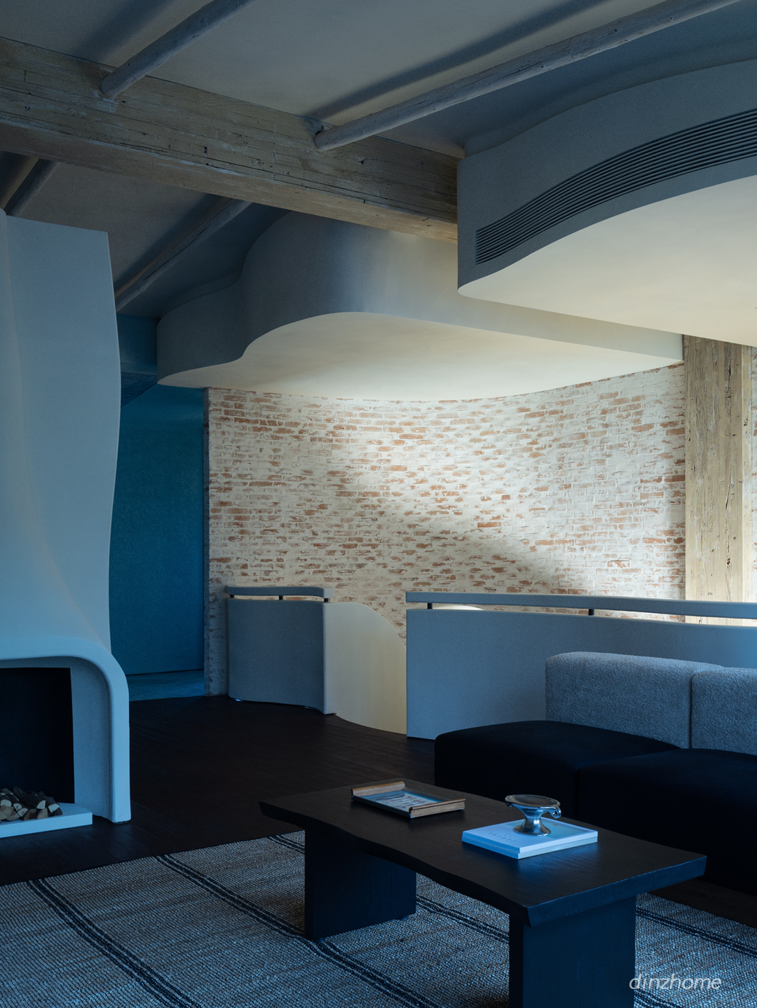 在墙面设计上,采用乳白色墙面与做旧红砖墙面交织的布局,构建出层次分明且富有自然气息的空间底色。乳白色墙面选用环保乳胶漆,以柔和的质感呈现出蓝调时刻中天空的纯净与通透,为空间奠定轻盈、明亮的基调,同时能最大化反射光线,让室内光影更显柔和。