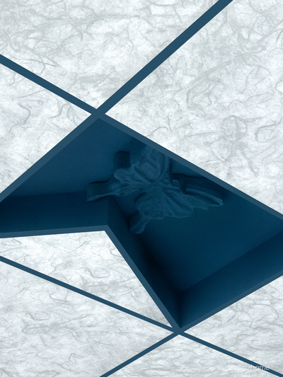 试衣间吊顶设计为 15 格方形灯箱,灯箱框架线条简约利落,点亮时整体光线均匀柔和,避免产生明暗死角。灯箱内凹区域镶嵌一枚蓝色蝴蝶浮雕,翅膀纹路经过精细雕刻,呈现出自然的层次感,内凹设计让蝴蝶浮雕在灯光映衬下形成轻微阴影,仿佛蝴蝶停驻在暮色中,既呼应了 “蓝调时刻” 的自然意境,又为试衣间增添了精致的艺术细节,提升顾客的体验感。