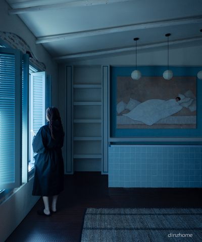 试衣间区域墙面选用具有肌理感的蓝色艺术涂料,为试衣间营造出私密、静谧的氛围,让顾客在试穿衣物时更显放松。百叶窗叶片表面涂刷清漆与墙面保持一致,闭合时可调节光线强度,让室内光线始终保持柔和,避免强光直射影响衣物色彩呈现;开启时则能引入室外的自然光线,与室内灯光交织,形成如同傍晚时分的柔和光影。