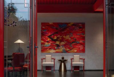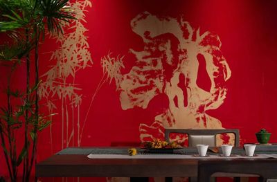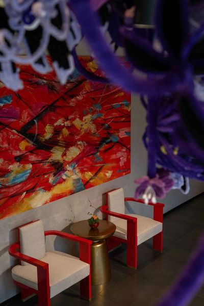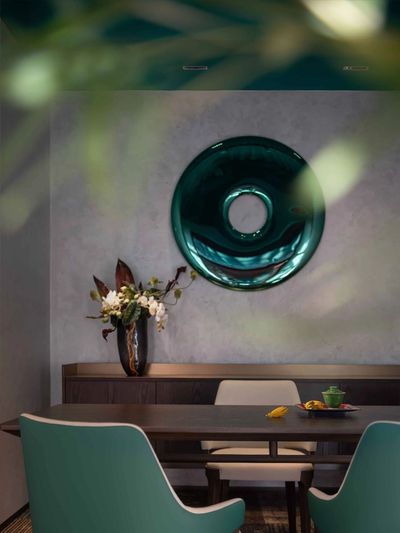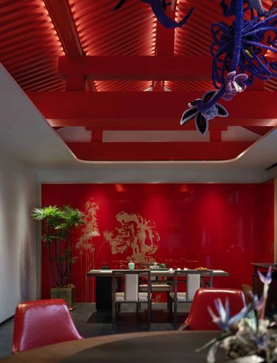取东方“红为尊”的意韵,以故宫红为主配色,打破皇权的禁锢,将其化作厅堂的热烈底色。抽象红画如衣袂翻飞,红椅似首饰点缀,既是东方等级秩序的温柔反叛,也是业主对“红”之妩媚的私人注解。