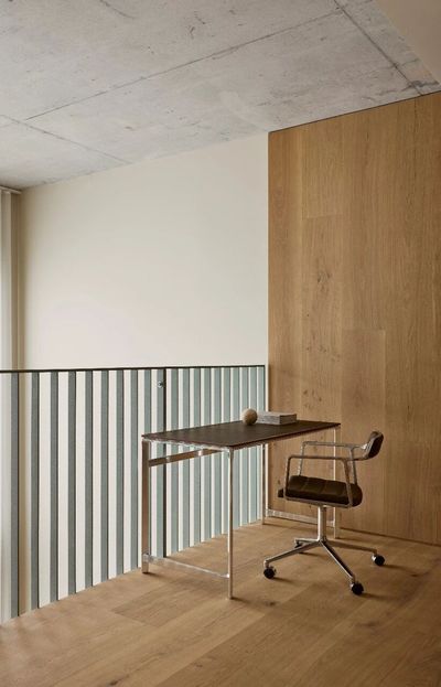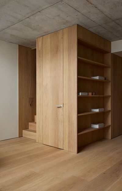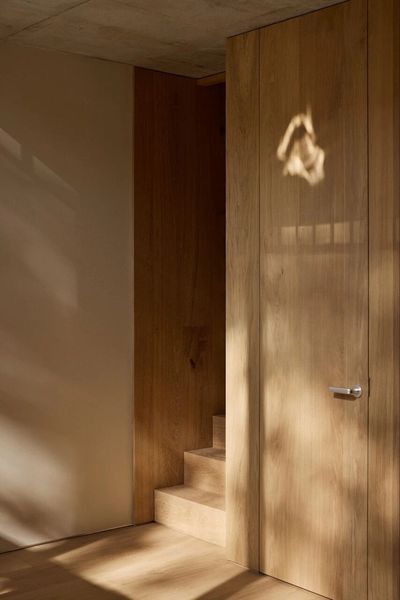 The core of the space is made of the classic Dinesen Layers Oak oak, presenting a serene and elegant visual effect and ensuring structural stability. Continuous wooden surfaces run through the interior, with Layers HeartOak used locally to add natural textures and a sense of history, and natural cracks are fixed by oak butterfly tenons. The wood also extends to the wall panels, custom stairs, bookcases and headboards, creating a warm and unified visual language.