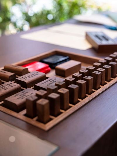 用以拓印的本地循环木制印把,陈列在“长物亭”的长桌上。