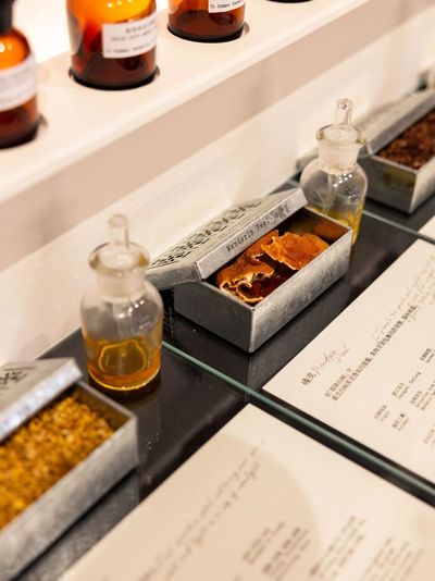 进入店铺,映入眼帘是“调香室”,香水原料如同博物馆般展览,复古的褐色瓶身,标写着每一种气味的名字。摄影(上图):胡凯,@AGENT PAY
