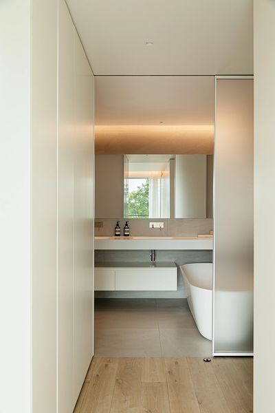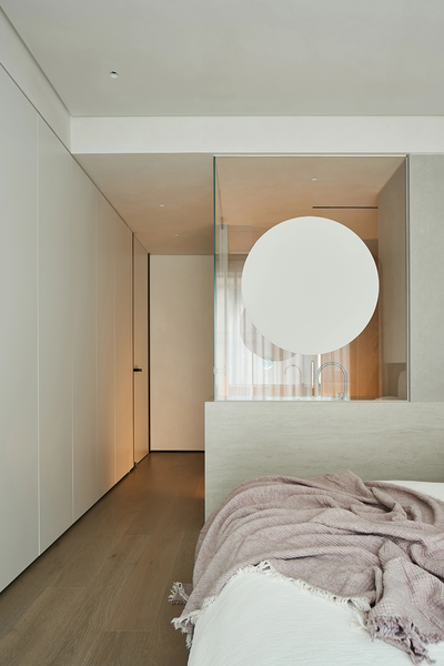 通向卫浴的廊道,光线柔和,隐约能瞥见里面的布局。定制的衣柜线条利落,白色与木色的搭配,既显整洁,又饱含自然气息。
