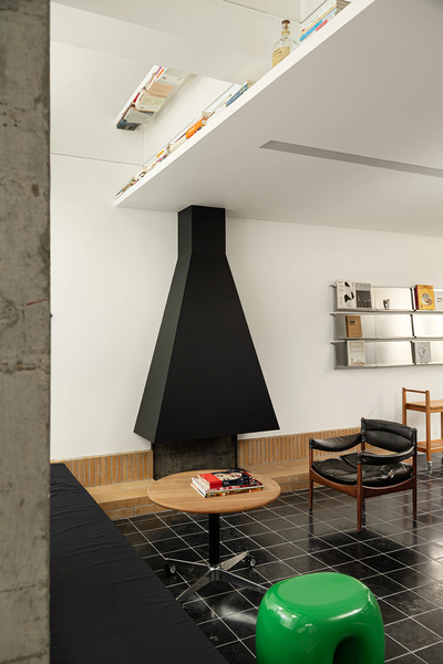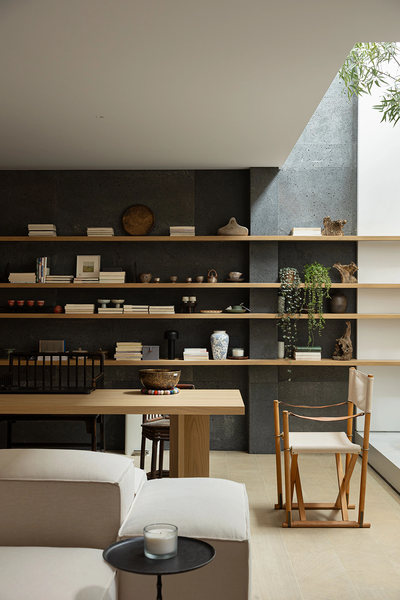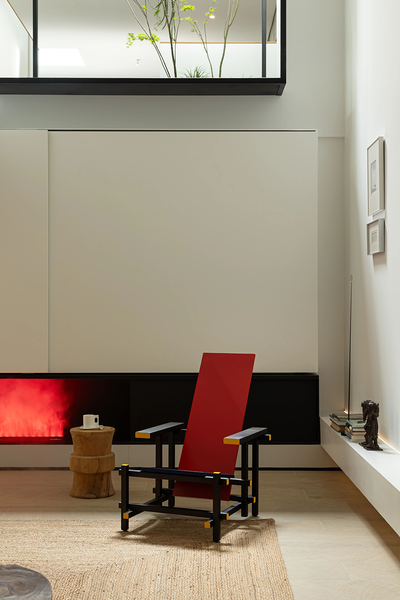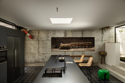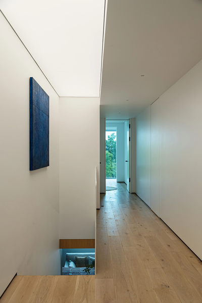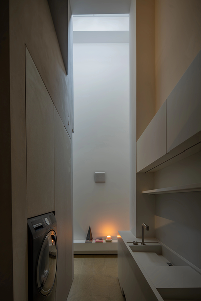 设计师将原本一跨的采光井延伸至整个地下室开间的尺度。光线肆意的倾泻而下,洒在雕塑般的室内空间。