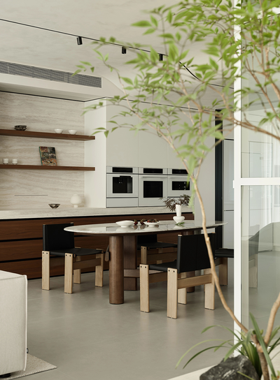 视线流转,餐厨空间与客厅紧密相连。椭圆形餐桌的周围,座椅简约大方,皮质与木质让人的坐感与触感更为温暖舒适。