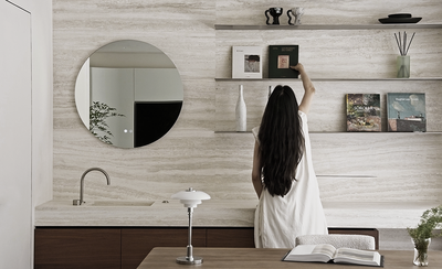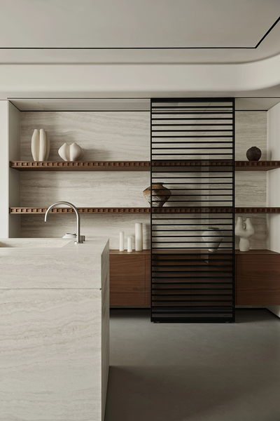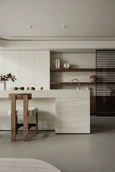 吧台区域石材的肌理与木质的温润相融,精致的器皿有序摆放,仿佛在等待一场美食与爱的邂逅。