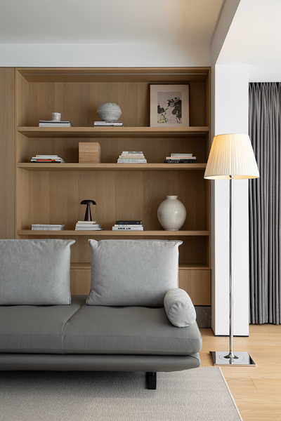 与沙发相邻的茶室,木质带着自然的纹理与温度,陈列架上的器物静静伫立,诉说者主人对于禅茶生活的品味与故事。