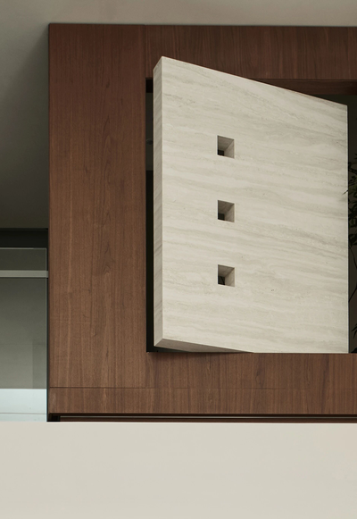 一侧的墙面轻轻转动方向,立面流出几处方形透光口,光线在此得以更加诗意的漫游