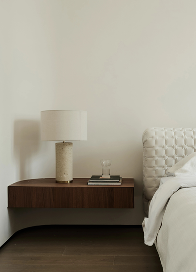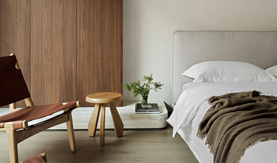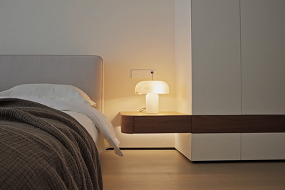 步入二层的主卧,瞬间被宁静与雅致包裹。柔软的床品铺展,仿佛云朵般轻柔,搭上的深棕色毛毯,为空间添了几分温暖质感。