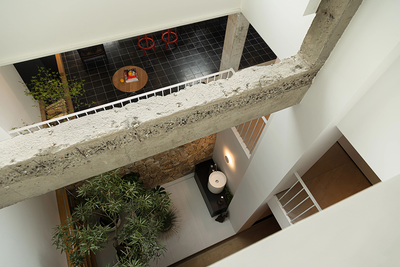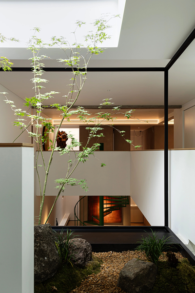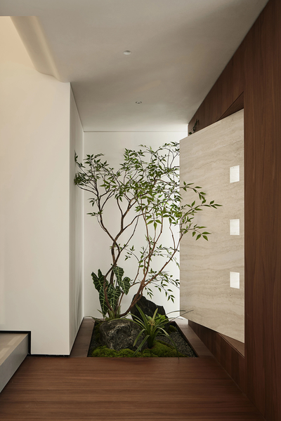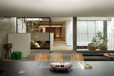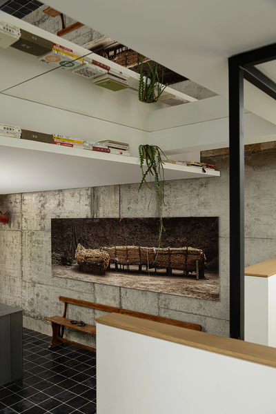 负一层空间有着细腻的层次划分,下沉式的烘焙工作室和客卧相对。中间是光线洒落的天井和蓬勃生长的植物,下沉式的设计往往像是一种宣言。
