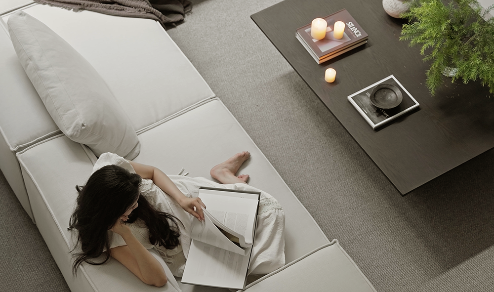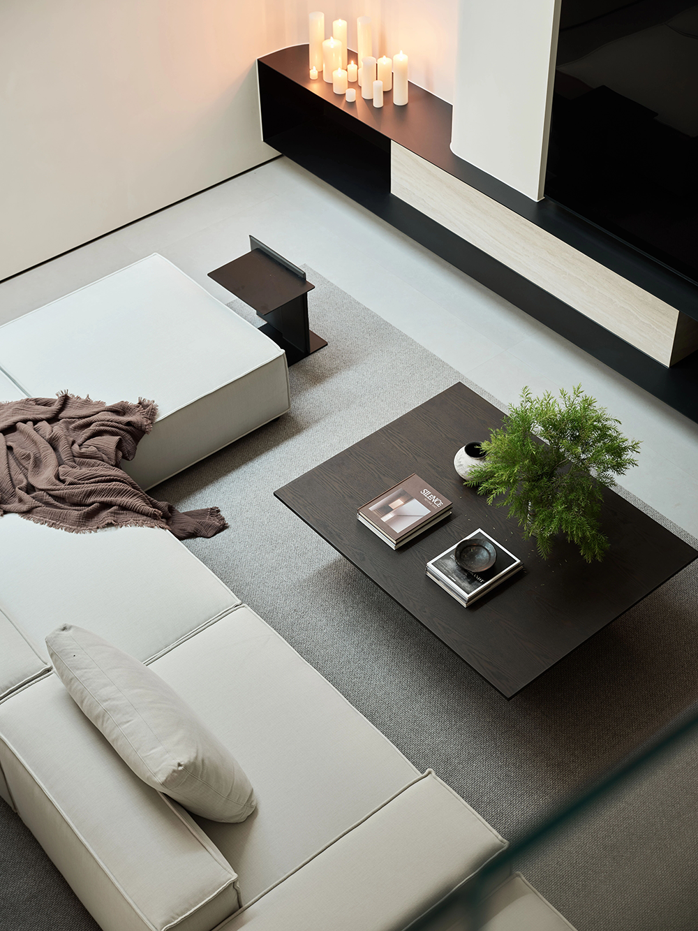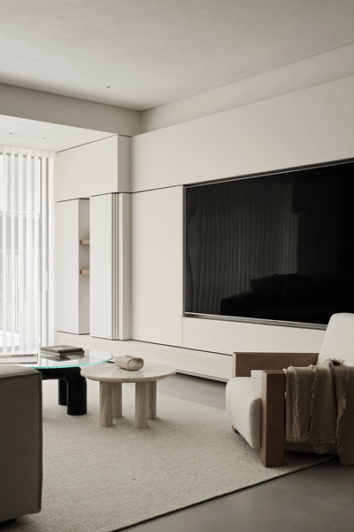 浅色沙发慵懒地承载着时光,深色茶几似沉稳的画框,框住绿植的鲜活与书籍的墨香。电视墙旁烛光摇曳,为空间晕染出温馨的光晕。