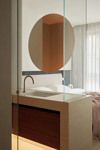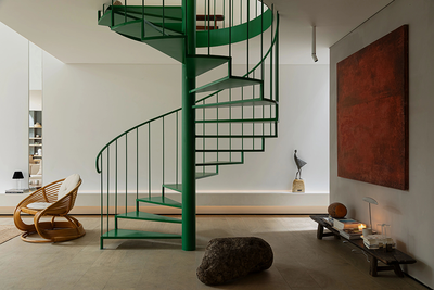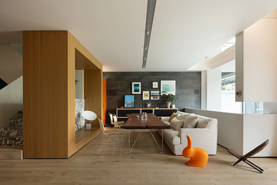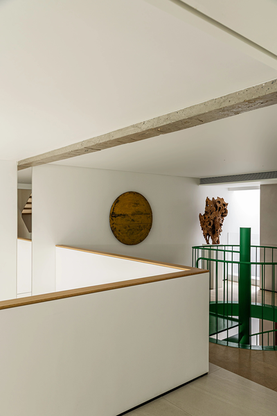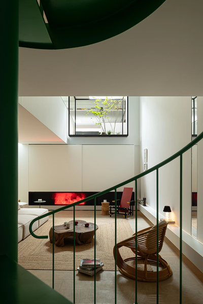 这层区域有它的表世界和里世界,穿过旋转楼梯旁的墙。一道狭窄的过道后隐藏着盥洗和洗衣区同时也通过挑空区域让空气和人都能彼此互动。