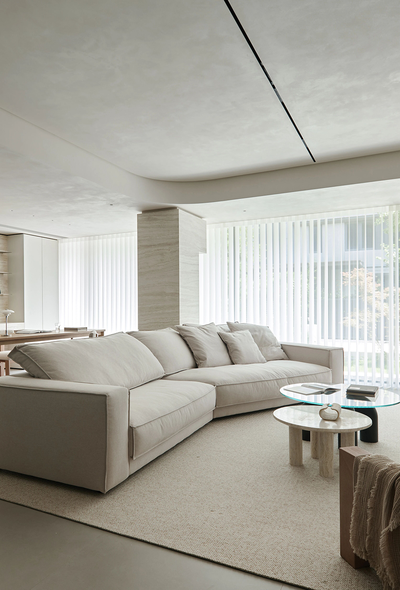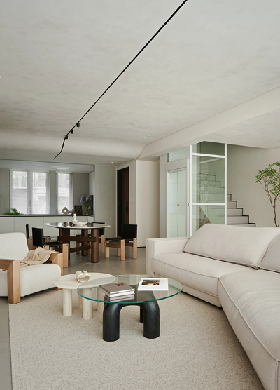 客厅里,浅色调的沙发柔软而宽大,仿佛能将所有疲惫都温柔包裹。玻璃与石材搭配的茶几错落摆放,书籍与物件透着生活的闲情逸致。