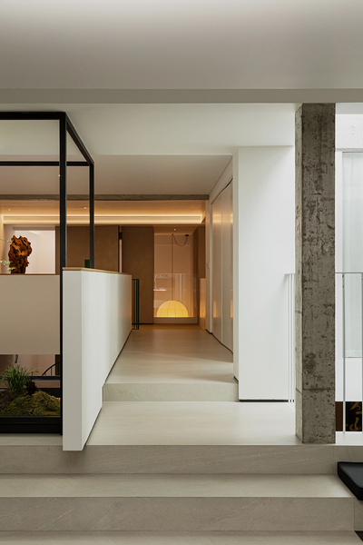 脚步拾级而上,来到一层,踏步处的绿植生机勃勃,光线与自然的元素依然延续,空间的舒适感也因为真实自然的介入而愈发浓郁。