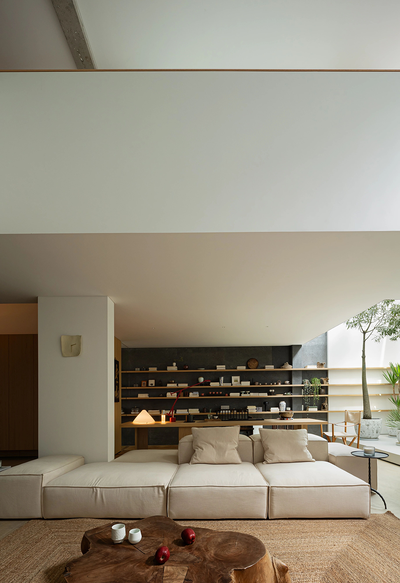 天井下是茶室的视觉延伸地,像是欢迎每一道光走进来饮一杯叙叙旧,又像是勾引着每一个人走过去抬头完成与天空的对望。