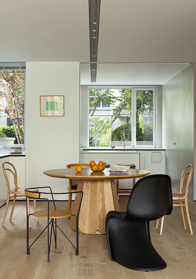 即将开餐的家庭成员们,可以选择他喜欢的椅子落座,不必为了视觉上的规整而强行统一全家人不同年龄段的审美。