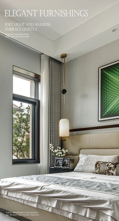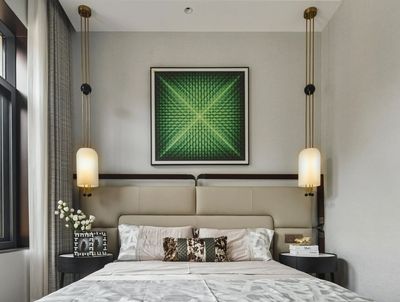 卧室二(女儿房)拱形落地窗引天光与景致入室,增空间通透浪漫,灯光与自然光交融,夜晚营造静谧温馨;复古皮革床头搭配格纹床品,糅合复古与现代精致,墙面错落的艺术画组合,又为空间注入艺术灵动感,传递居者审美意趣。