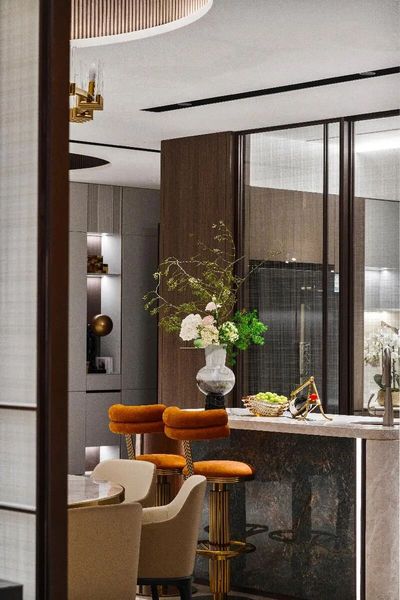 餐厨空间采用开放式 半通透布局,中厨以金属玻璃移门隔断维持空间通透感,使西厨社交互动(吧台备餐、亲友小聚)与餐厅宴请功能无缝衔接,动线流畅且互动感十足。