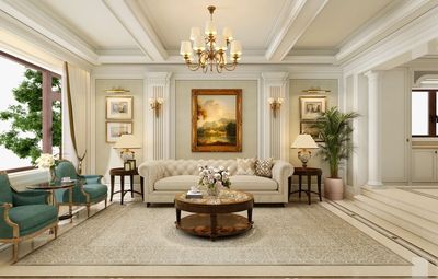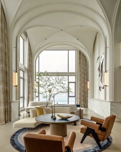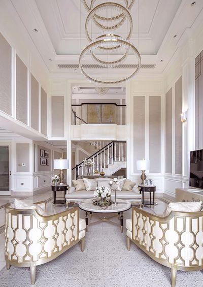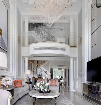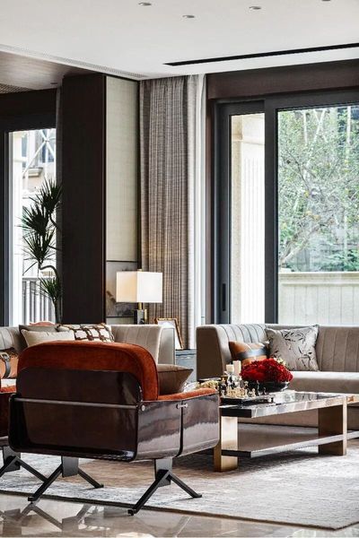 客厅巨幅落地窗如“天然画框”,把庭院的绿意、户外的建筑肌理都“装”进室内。晴日里,阳光漫过沙发,在大理石地面漾开光斑;雨天时,看雨丝敲打着玻璃,室内暖光与室外朦胧相映,通透又治愈。
