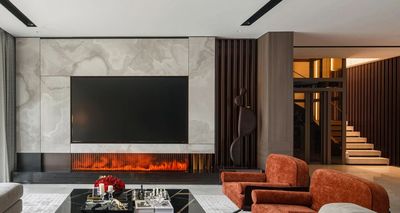 客厅电视墙以天然石材铺陈,流动的纹理如山水晕染,自带 “奢而不骄” 的气场;下方嵌入式壁炉跃动着暖光,为冷硬石材晕开一层温柔底色。深色木质与金属线条巧妙勾勒,让空间在 “高级感” 之余,又多了几分温润烟火气。