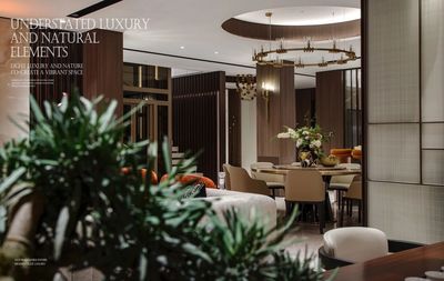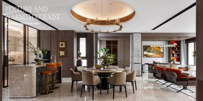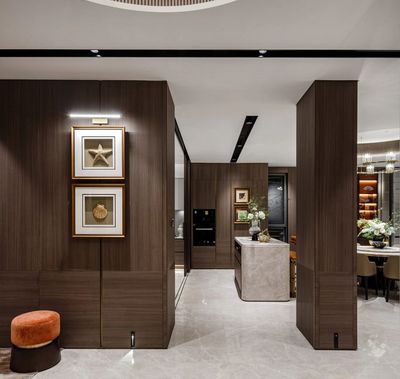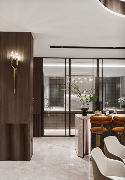 温润木饰面、大理石(岛台、地面)与金属线条(吊灯、吧台椅支架),木质的暖、石材的雅、金属的精致相互平衡,细节间流露低调轻奢质感。