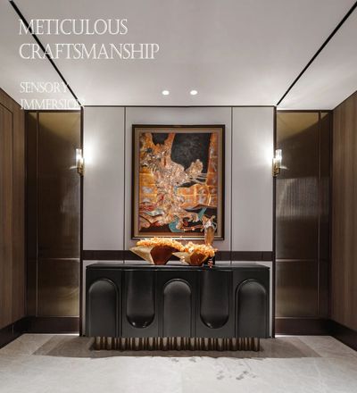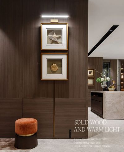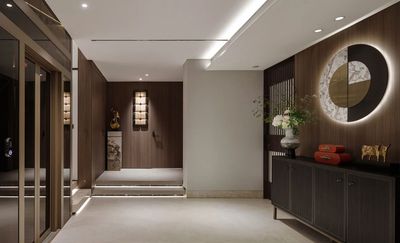 入户玄关设计以 “光影与材质共生” 为核心:深色木饰面的温润衬着大理石的莹润,铺就沉稳基底;艺术吊灯搭配弧形灯槽,让光线如流水般晕开柔化空间。
