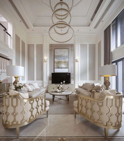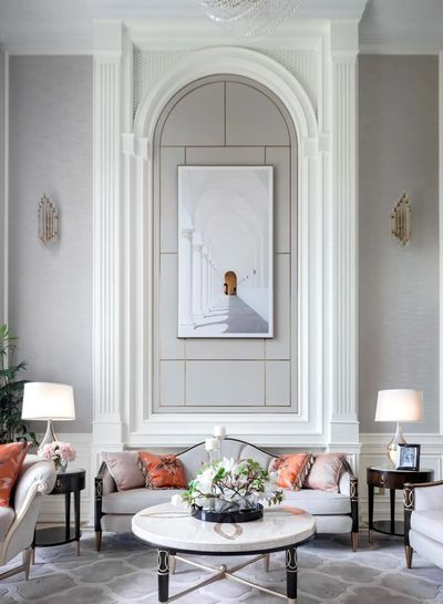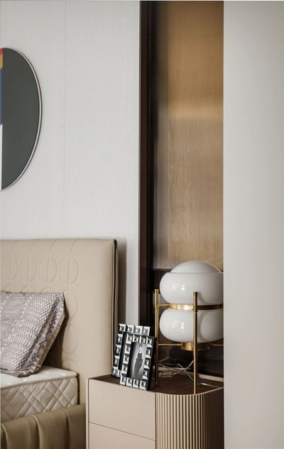 局部香槟金色艺术玻璃饰面板与球形吊灯、家具金属元素呼应,低调契合 “精致不张扬” 的审美。