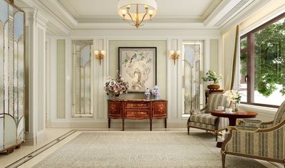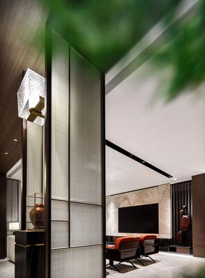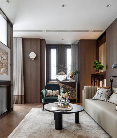 圆形饰画的花鸟纹样、苍劲盆景的自然意趣,以 “点到即止” 的方式植入东方元素,让现代空间与中式雅致悄然共生