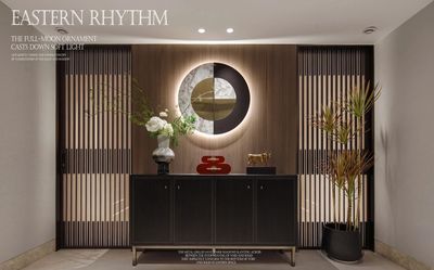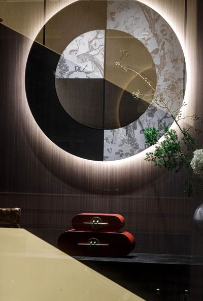 负一层地下室风格上,实现现代轻奢与东方雅韵的共生:圆形艺术装置融合水墨花鸟纹理与金属质感,背光设计既勾勒出东方 “圆融” 意境,又借光影营造轻奢精致感。