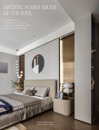 卧室一(儿子房)睡眠区的米色压纹软包床头质感柔润既显轻奢精致,墙面浅灰肌理壁布漾出静谧高级,营造松弛休憩氛围。