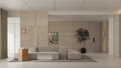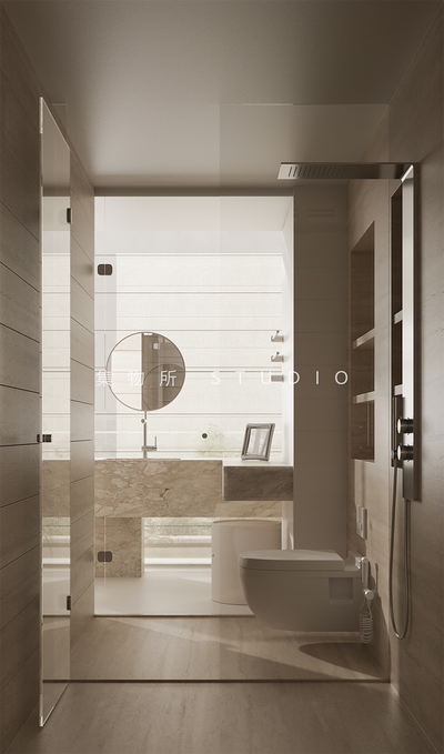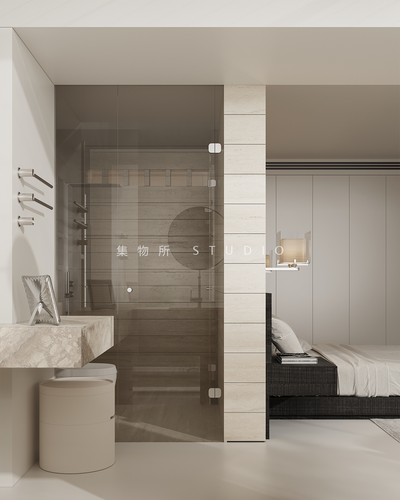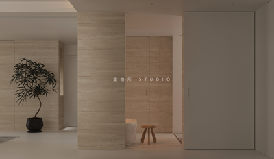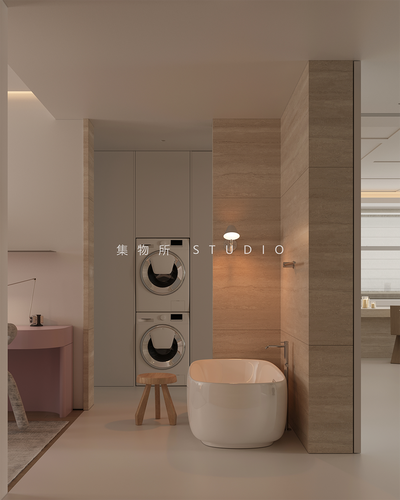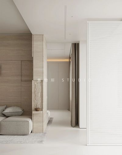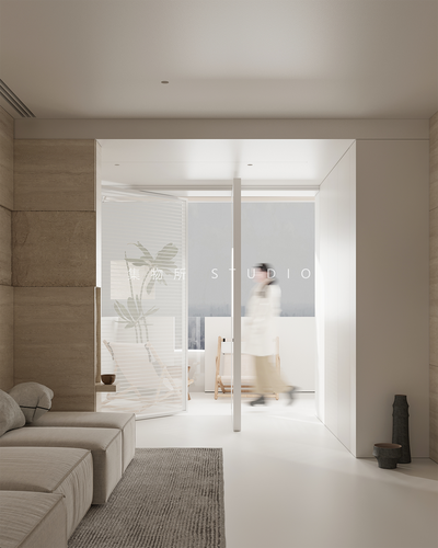 空间的通透性于光发生了化学反应,在材质的选择上,运用了米色的石材和地面白色的瓷砖作为基准色,希望克制又有质感,承重墙体作为一个结构柱让垂直关系更加明朗,伴着材质的肌理变化,粗犷的,细腻的,柔和的,坚硬的,不同的角度都和旁边的附加空间会随着角度而产生感知的变化,形成内向空间的