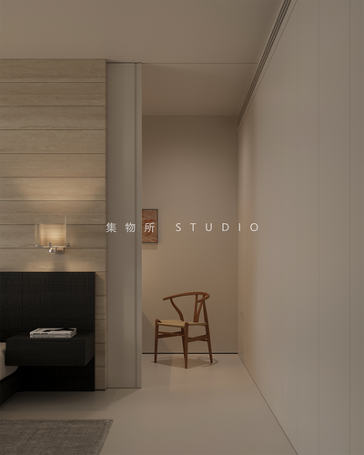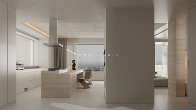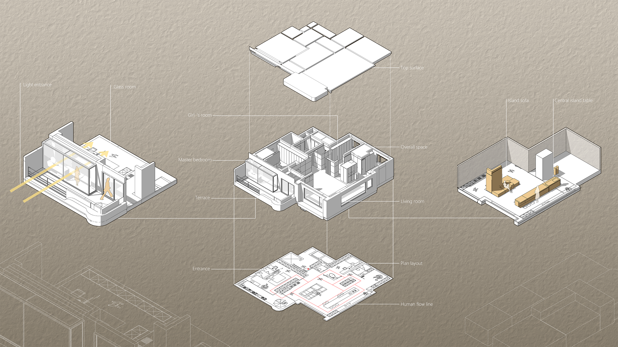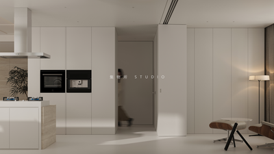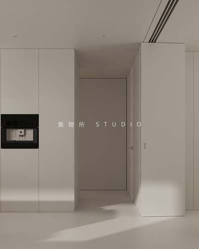 中间围绕的几何柱体,是过道,也衔接空间的灰空间,更是极强的收纳功能,家电收纳全部被规整。旁边的墙体,会随着两扇幽灵门的开合,形成通道,形成视觉延展,达到几个空间相互链接的组合式场景。空间会因为趣味,而从理性变得感性,光感会因为空间的组合形式附加场景感,而这个场景感,就是改变我们对于材质自身硬朗或柔和的另一种感知。不被材质定义,是我们希望表达的。