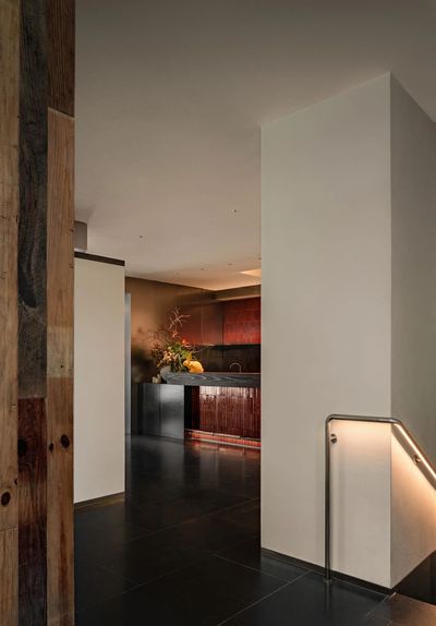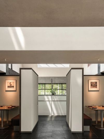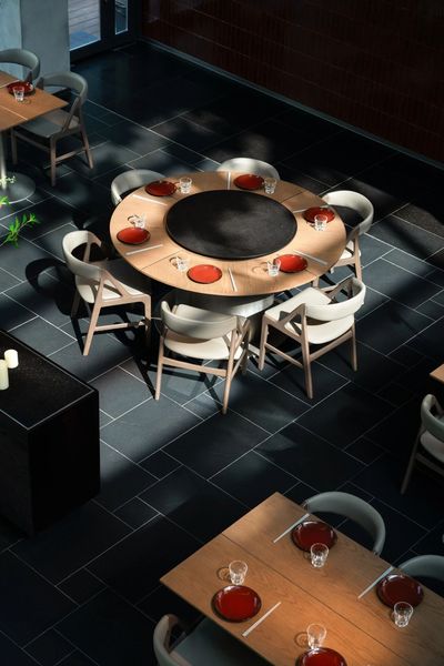 餐厅由地上两层和带有下沉庭院的地下一层组成。砖、木、石材切割的体块贯穿于整个设计之中,应用于立柱、墙面和分隔构件,具有统一而多样的表现力。