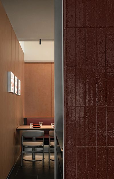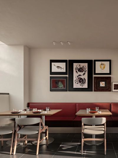 细目格栅为窗为门,与光泽感低调的红色条砖墙渲染出温暖的生活感,艺术品皆以虾蟹瓜果为题,质朴可爱,无论在哪里落座,都有小景可看。