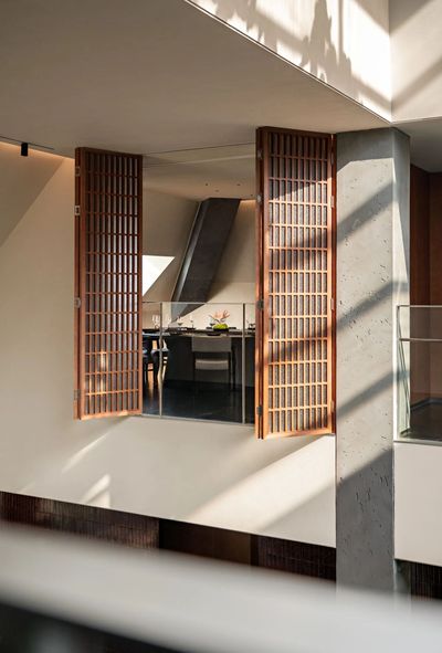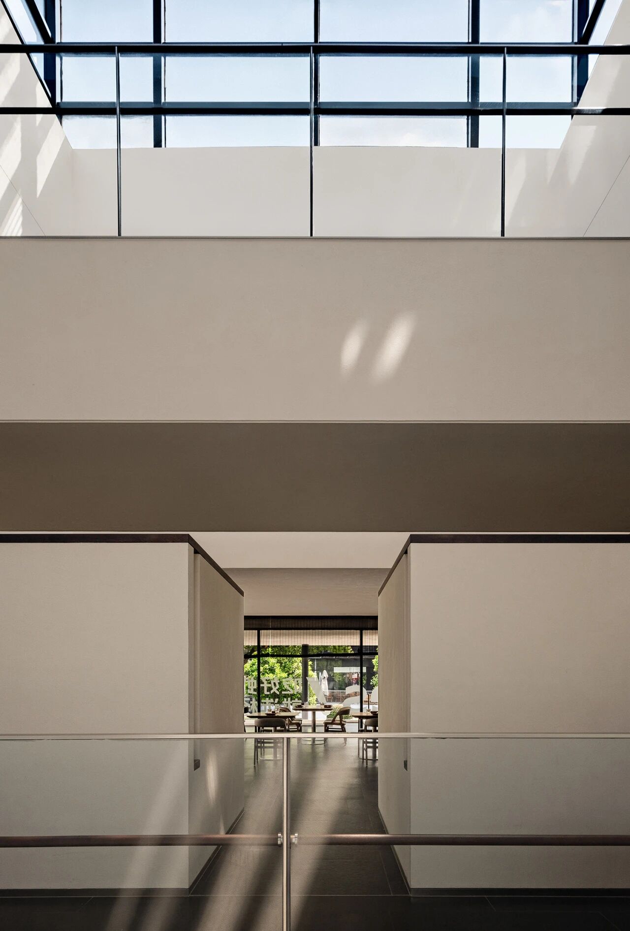 坡屋顶下扶梯折回而上,带来江南园林隐秘的探索感,豁然开朗的二层回廊由中央组织起整层交通流线,空间垂直向上通透的光感在这里更加动人心神。